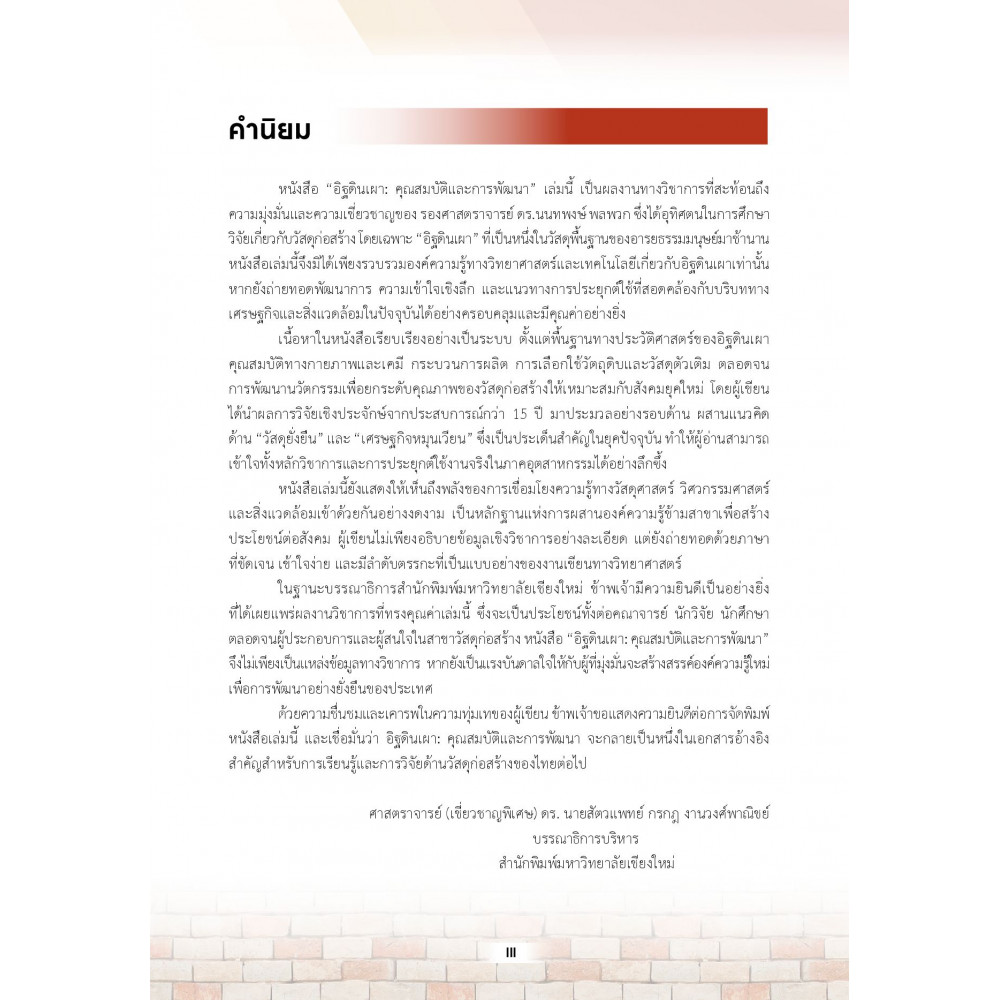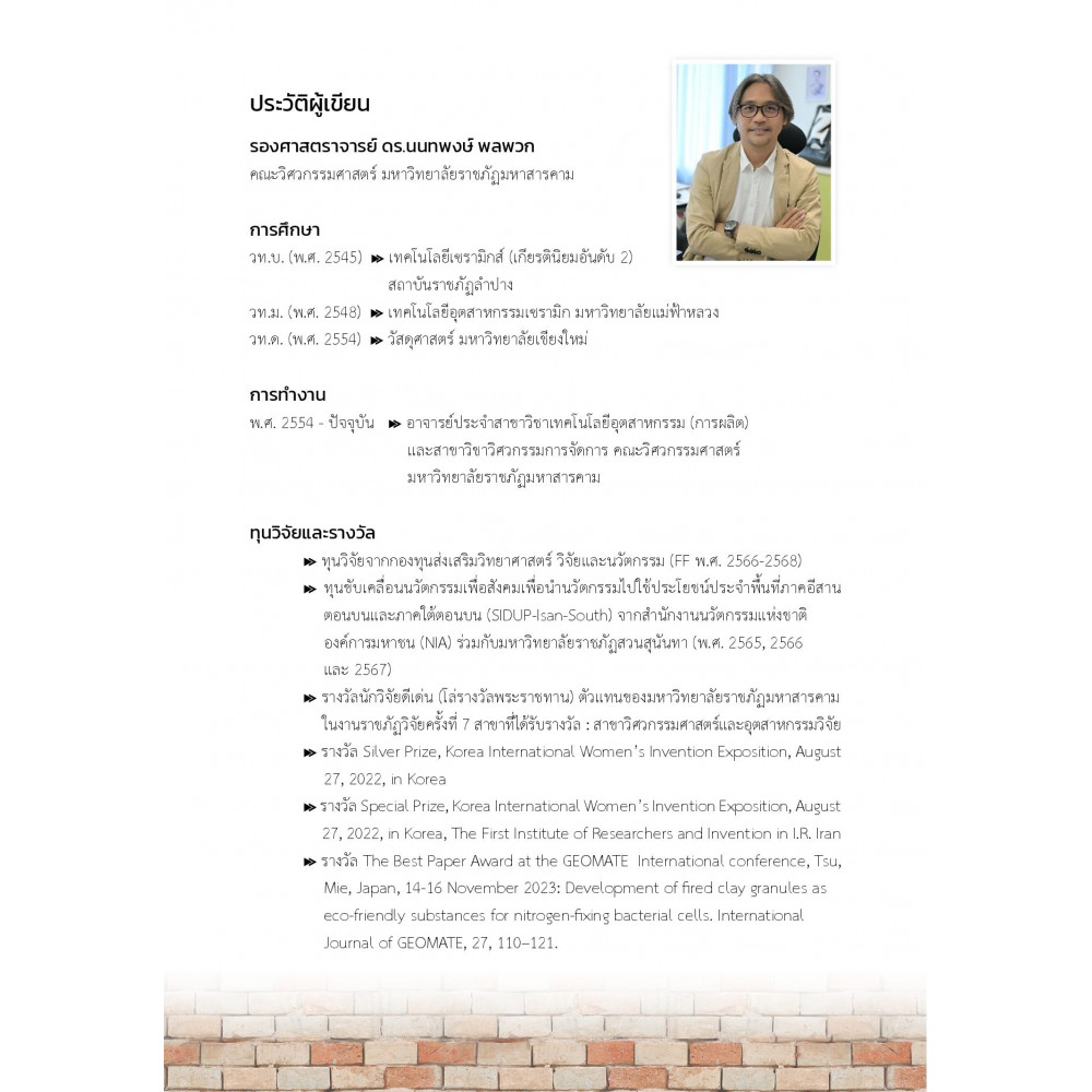 หนังสือเล่มนี้ได้รวบรวมองค์ความรู้ทั้งเชิงพื้นฐานและเชิงลึกของอิฐดินเผาไว้อย่างครบถ้วนครอบคลุมตั้งแต่สมบัติของดินเหนียว กลไกและอิทธิพลของกระบวนการเผาตลอดจนบทบาทของวัสดุตัวเติมจากทั้งภาคเกษตรและอุตสาหกรรมไม่ว่าจะเป็นกลุ่มที่สร้างรูพรุนหรือกลุ่มที่เปลี่ยนแปลงโครงสร้าง เพื่อนำเสนอแนวทางใหม่ของการพัฒนาอิฐดินเผาสมัยใหม่ที่มีสมบัติด้านความแข็งแรงน้ำหนักเบา และเป็นมิตรต่อสิ่งแวดล้อม หนังสือเล่มนี้จุดเด่นคือการบูรณาการองค์ความรู้ด้าน วิศวกรรมศาสตร์ เศรษฐศาสตร์ และสิ่งแวดล้อมเข้าด้วยกันที่ช่วยให้ผู้อ่านเข้าใจทั้งศักยภาพ และข้อจำกัดของวัสดุได้อย่างรอบด้านอีกทั้งยังเชื่อมโยงกับเป้าหมายการพัฒนาที่ยั่งยืน และการจัดการวัสดุเหลือทิ้งเพื่อให้เกิดคุณค่าใหม่