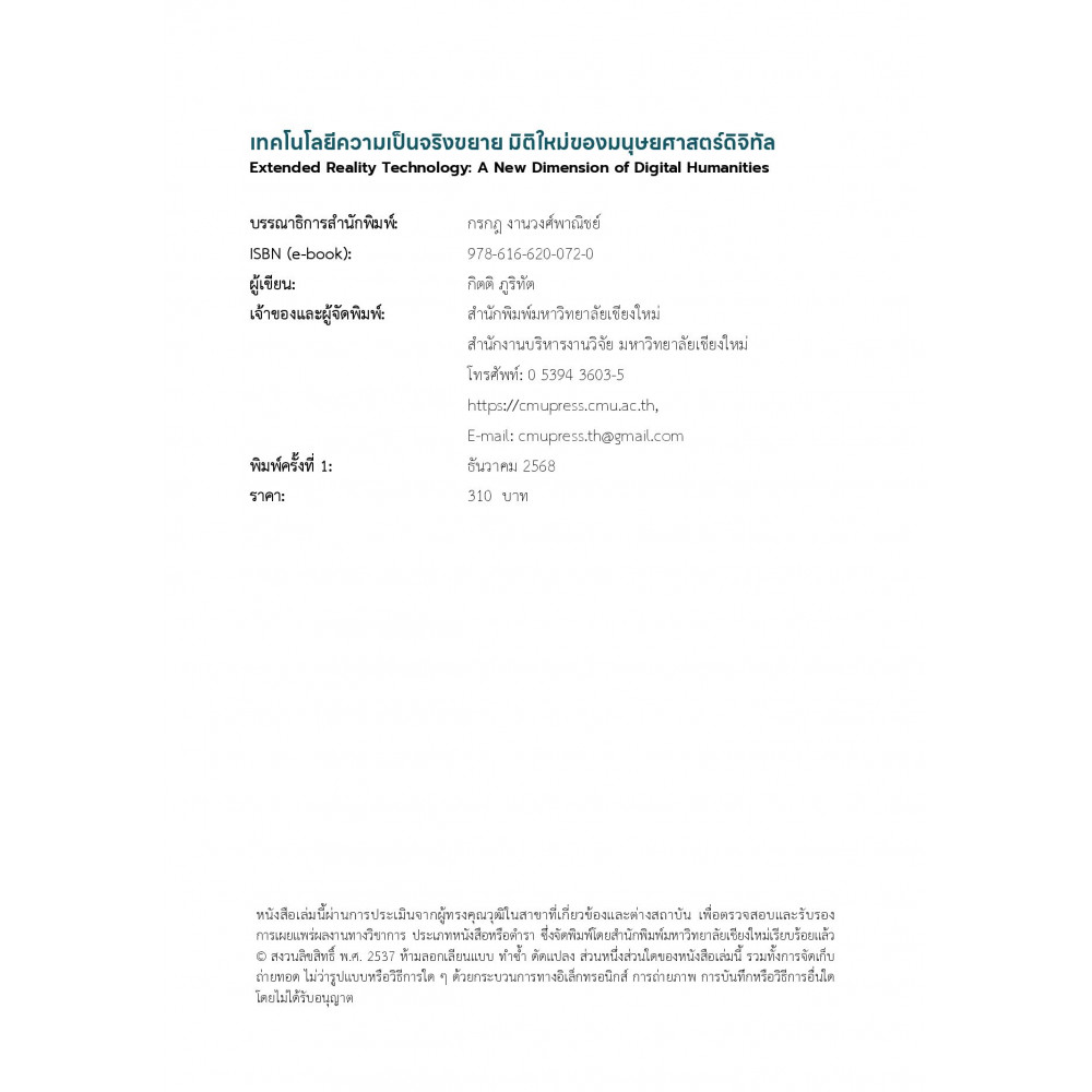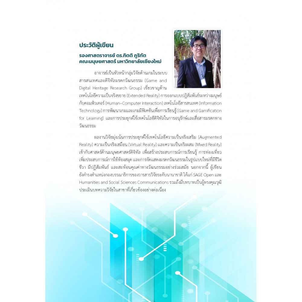 นำเสนอการบูรณาการองค์ความรู้ด้านเทคโนโลยีความเป็นจริงขยาย ครอบคลุมทั้งความเป็นจริงเสริมความเป็นจริงเสมือนและความเป็นจริงผสมเข้ากับศาสตร์ด้านมนุษยศาสตร์และวัฒนธรรมเพื่อเปิดมิติใหม่ของ "มนุษยศาสตร์ดิจิทัล"ที่เชื่อมโยงการเรียนรู้เชิงทฤษฎีกับประสบการณ์เชิงปฏิสัมพันธ์ในโลกเสมือนจริงอย่างมีความหมายเนื้อหาประกอบด้วยแนวคิดพื้นฐาน ทฤษฎีสำคัญ รวมถึงกรณีศึกษาที่ถ่ายทอดกระบวนการประยุกต์ใช้เทคโนโลยีอย่างเป็นรูปธรรม