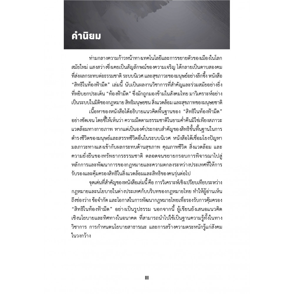 คุ้มครองหรือรับรองไม่ว่าจะเป็นเรื่องสิทธิ เสรีภาพและความเสมอภาคอันเกี่ยวข้องสัมพันธ์กับการดำรงอยู่ของดุลยภาพของธรรมชาติที่สมควรประกอบไปด้วยความสว่างของท้องฟ้าในเวลากลางวันและความมืดของท้องฟ้าในเวลากลางคืน เพื่อประโยชน์ต่อการดำรงชีพของมนุษย์ และการดำรงอยู่ของมนุษยชาติสืบต่อไป หนังสือเล่มนี้มุ่งสร้างความตระหนักรู้ถึง "สิทธิในท้องฟ้ามืด" ที่เป็นสิทธิขั้นพื้นฐานที่พึงจะได้รับในการปกป้องคุ้มครองหรือรับรองภายใต้บทบัญญัติที่ได้กำหนดไว้ตามกฎหมายของหลายประเทศ และมุ่งส่งเสริมให้ผู้อ่านทั่วไปได้เข้าใจถึงบริบทของ "สิทธิในท้องฟ้ามืด"ที่ควรอยู่คู่มนุษยชาติต่อไป