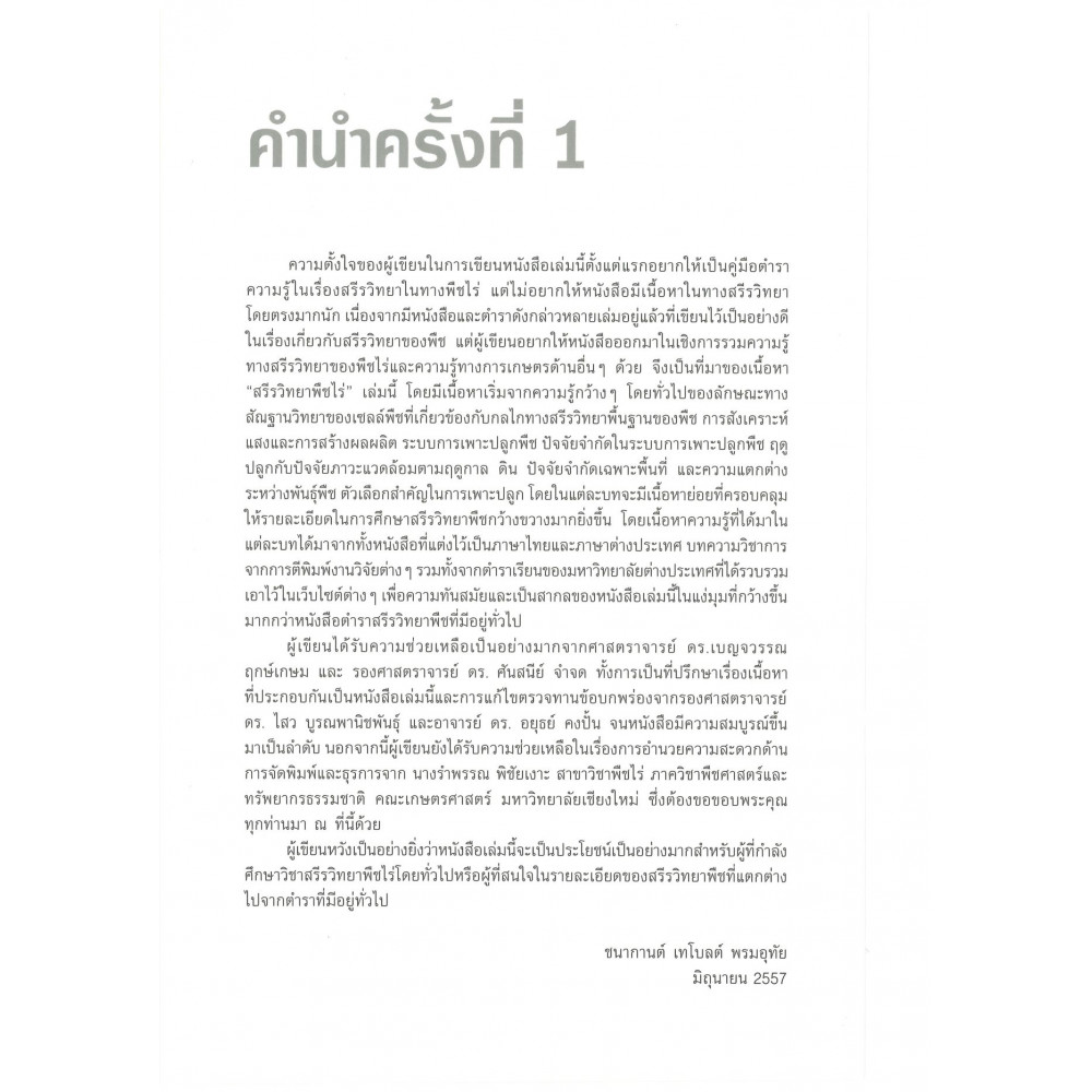 ความตั้งใจของผู้เขียนในการเขียนหนังสือเล่มนี้ตั้งแต่แรกอยากให้เป็นคู่มือตำรา ความรู้ในเรื่องสรีรวิทยาในทางพืชไร่ แต่ไม่อยากให้หนังสือมีเนื้อหาในทางสรีรวิทยา โดยตรงมากนัก เนื่องจากมีหนังสือและตำราดังกล่าวหลายเล่มอยู่แล้วที่เขียนไว้เป็นอย่าง ดีในเรื่องเกี่ยวกับสรีรวิทยาของพืช แต่ผู้เขียนอยากให้หนังสือออกมาในเชิงการรวมความ รู้ทางสรีรวิทยาของพืชไร่และความรู้ทางการเกษตรด้านอื่นๆ ด้วย จึงเป็นที่มาของเนื้อหา “สรีรวิทยาพืชไร่” เล่มนี้ โดยมีเนื้อหาเริ่มจากความรู้กว้างๆ โดยทั่วไปของลักษณะทาง สัณฐานวิทยาของเซลล์พืชที่เกี่ยวข้องกับกลไกทางสรีรวิทยาพื้นฐานของพืช การสังเคราะห์ แสงและการสร้างผลผลิต ระบบการเพาะปลูกพืช ปัจจัยจำกัดในระบบการเพาะปลูกพืช ฤดู ปลูกกับปัจจัยภาวะแวดล้อมตามฤดูกาล ดิน ปัจจัยจำกัดเฉพาะพื้นที่ และความแตกต่างระหว่างพันธุ์พืช ตัวเลือกสำคัญในการเพาะปลกู โดยในแต่ละบทจะมีเนื้อหาย่อยที่ครอบคลุมให้รายละเอียดในการศึกษาสรีรวิทยาพืชกว้างขวางมากยิ่งขึ้น โดยเนื้อหาความรู้ที่ได้มาในแต่ละบทได้มาจากทั้งหนังสือที่แต่งไว้เป็นภาษาไทยและภาษาตา่งประเทศ บทความวิชาการ จากการตีพิมพ์งานวิจัยต่างๆ รวมทั้งจากตำราเรียนของมหาวิทยาลัยต่างประเทศที่ได้รวบรวมเอาไว้ในเว็บไซต์ต่างๆ เพื่อความทันสมัยและเป็นสากลของหนังสือเล่มนี้ในแง่มุมที่กว้างขึ้นมากกว่าหนังสือตำราสรีรวิทยาพืชที่มีอยู่ทั่วไป